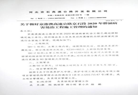 京港澳高速公路京石段沙2020年橋涵病害維修處治工程施工管理的通知