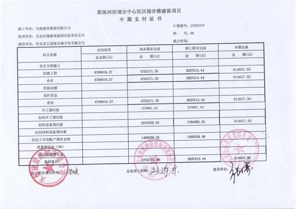 原涿州指調(diào)分中心院區(qū)綜合樓建設項目第六期中期支付證書