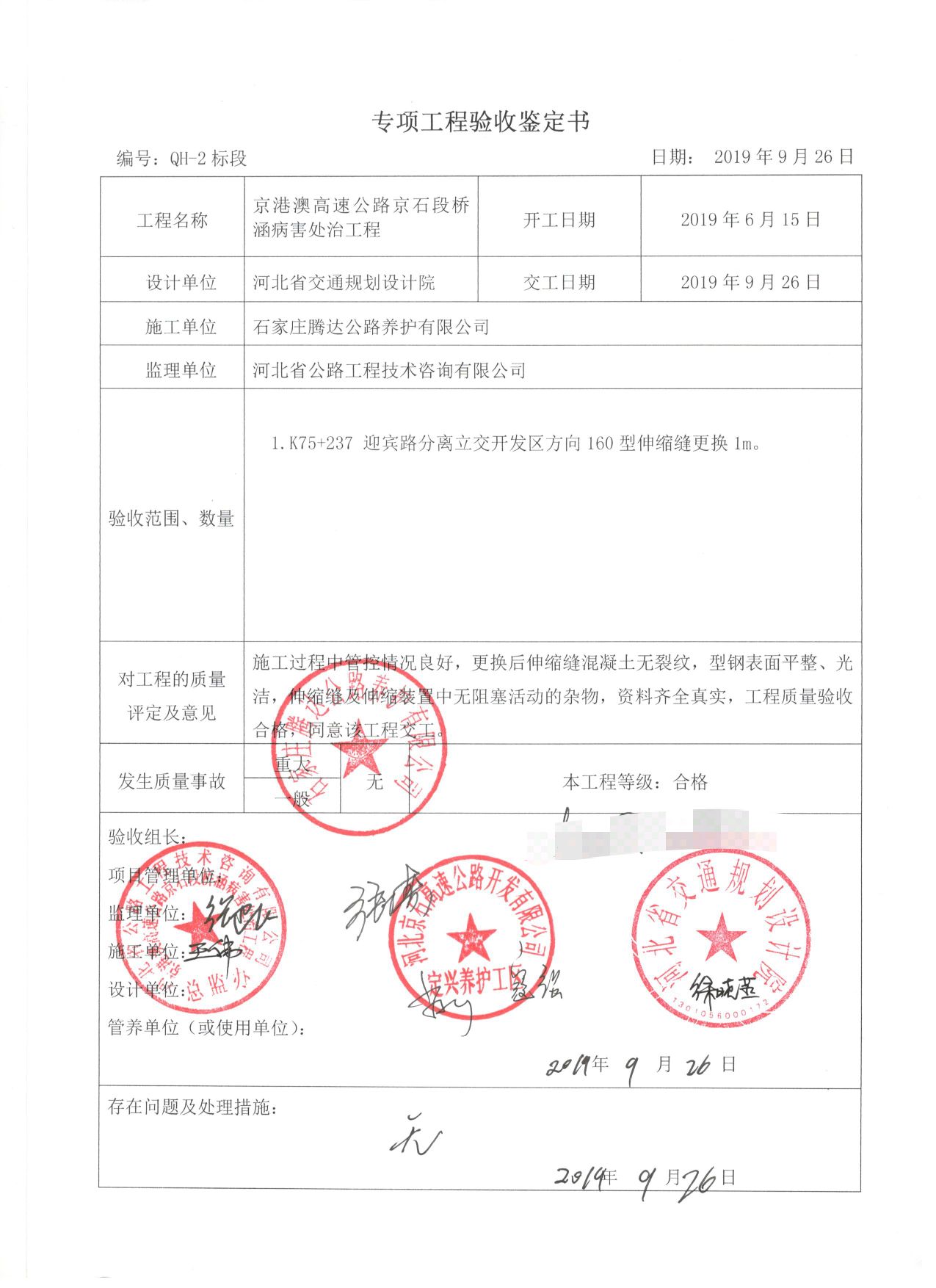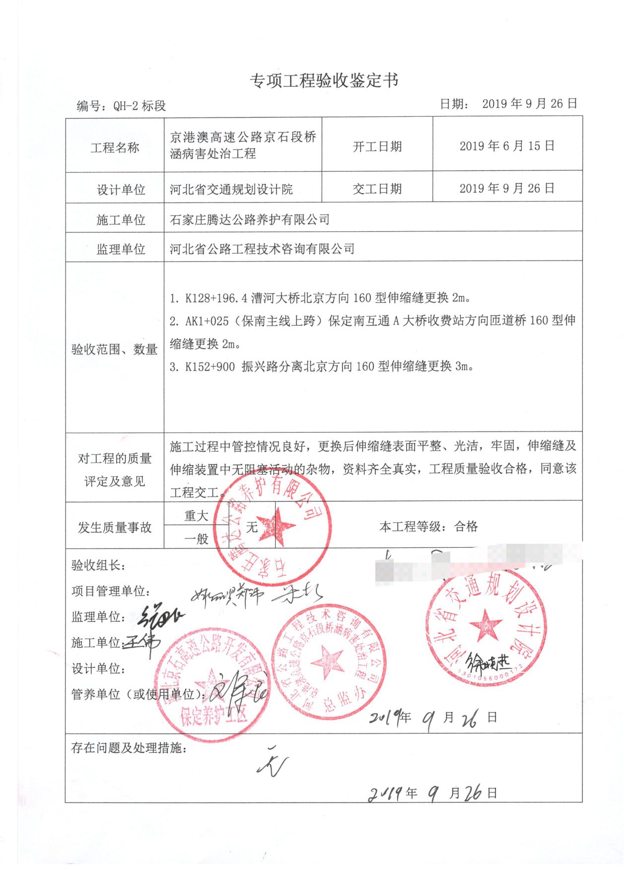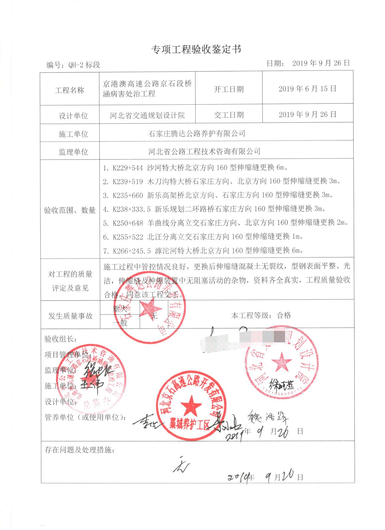 京港澳高速公路京石段橋涵病害處治工程QH-2標段工程專項鑒定書