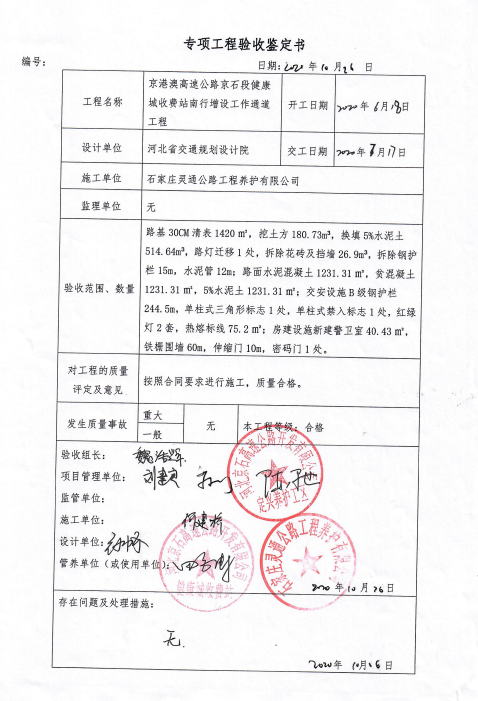 京港澳高速公路京石段健康城收費站南行增設工作通道工程驗收鑒定書