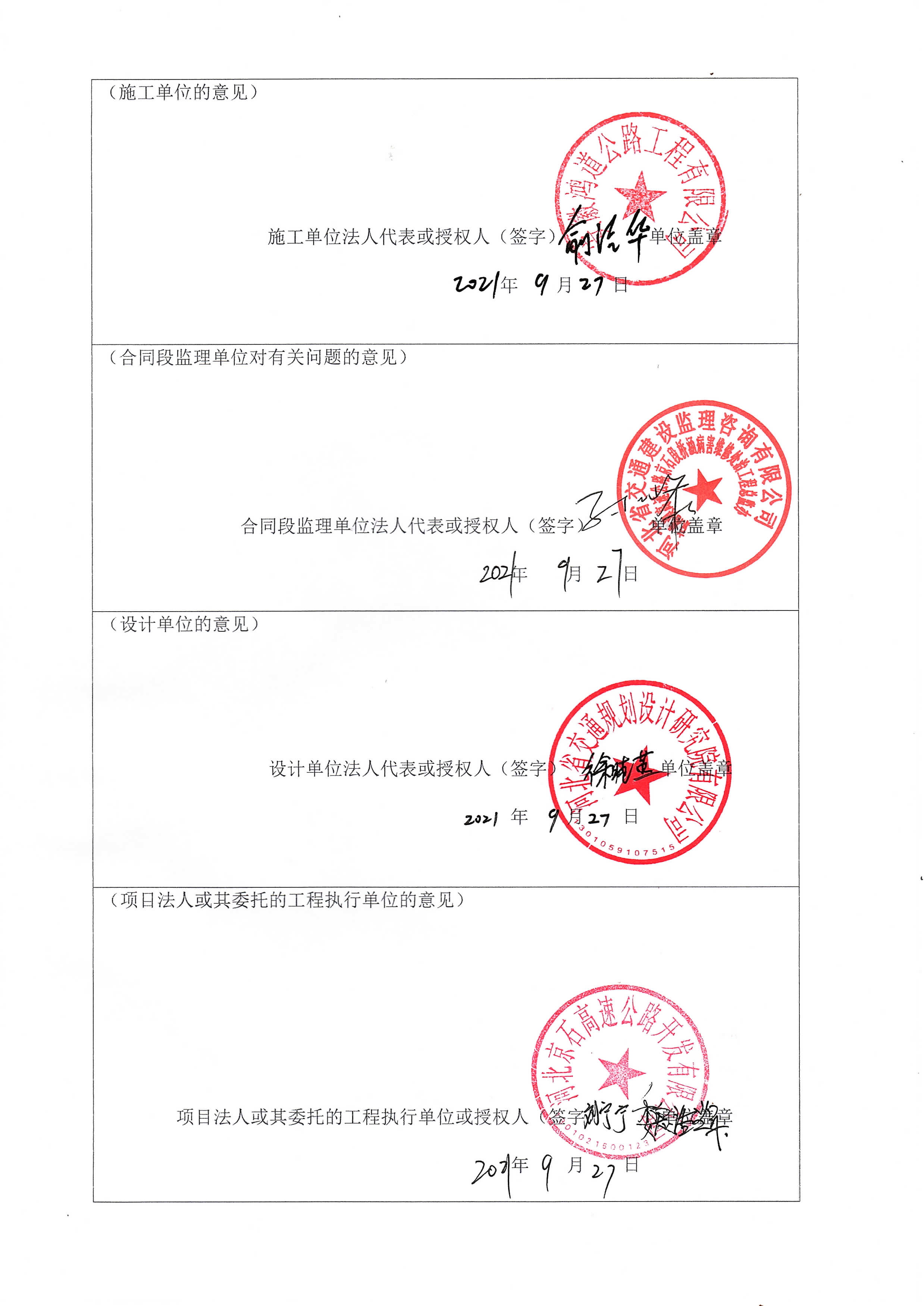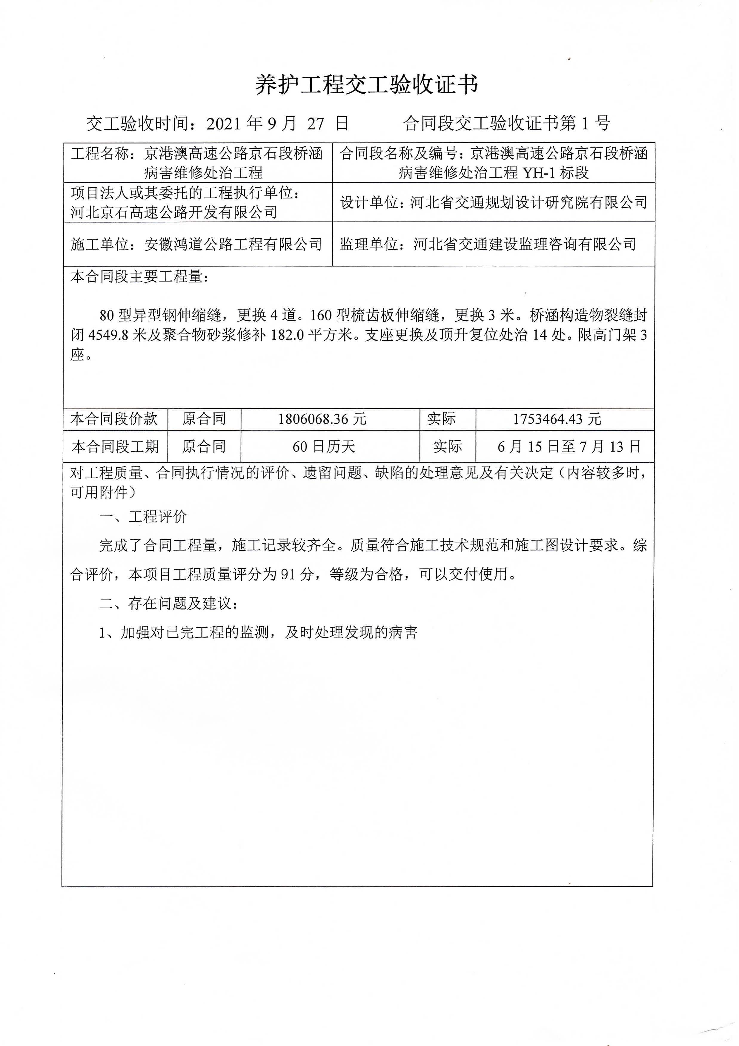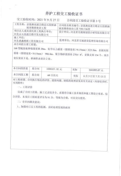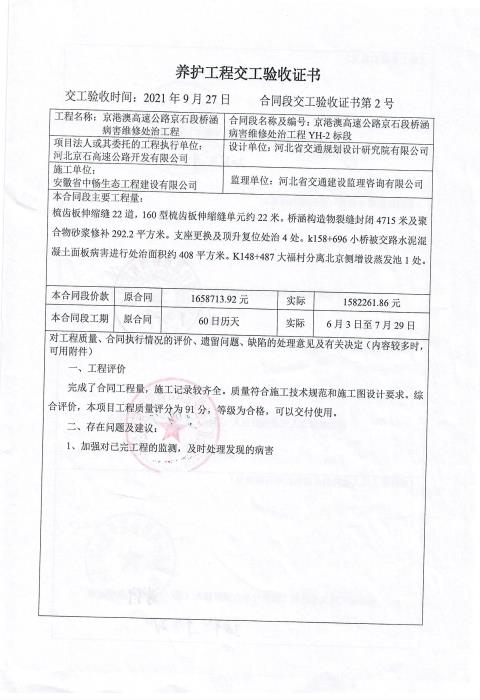 京港澳高速公路京石段橋涵病害維修處治工程驗(yàn)收證書(shū)