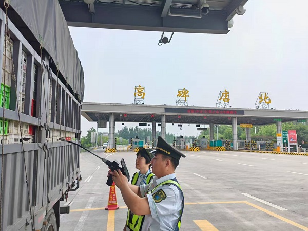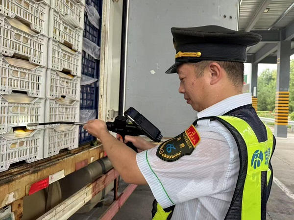 正午時(shí)分,收費(fèi)站廣場(chǎng)地表溫度直逼60℃,瀝青路面泛起微光。黨員們身著反光背心,手持查驗(yàn)終端,穿梭于一輛輛綠通貨車(chē)之間。掀開(kāi)篷布時(shí),撲面而來(lái)的熱浪裹挾著果蔬氣息,他們卻無(wú)暇擦拭額頭豆大的汗珠,仔細(xì)核對(duì)貨物品類(lèi)、查驗(yàn)裝載空間、拍攝留存影像?!跋募竟瞎赘瘔?,查驗(yàn)速度就是效率,更是民生溫度。”