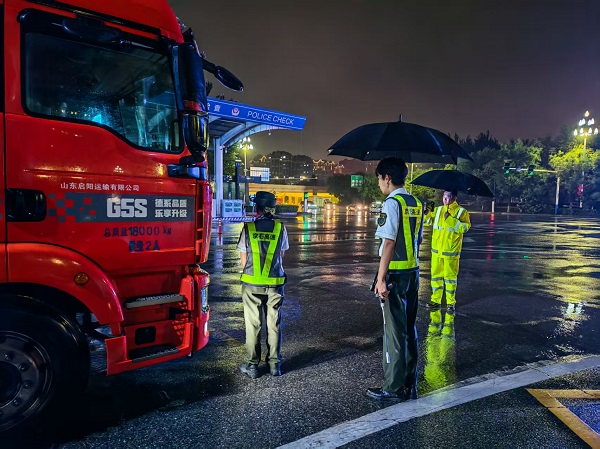 黨員在廣場(chǎng)上忙碌地?cái)[放警示錐,引導(dǎo)車(chē)輛有序停靠。暴雨中視線受阻,一輛貨車(chē)差點(diǎn)偏離路線,他一個(gè)箭步?jīng)_上前,隔著車(chē)窗大聲示意司機(jī)減速,直到車(chē)輛安全停穩(wěn),他才松了口氣,后背早已被汗水和雨水浸透?!霸绞沁@種時(shí)候,越得盯緊點(diǎn),綠通車(chē)輛耽誤不起,咱們黨員更得頂上去。”他抹了把臉上的雨水。