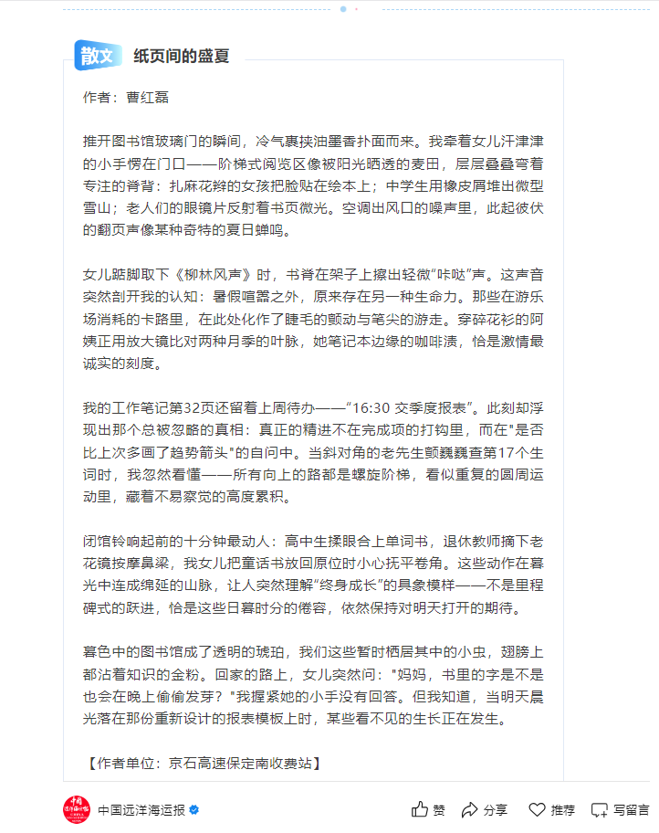 【中國遠(yuǎn)洋海運(yùn)報】紙頁間的盛夏