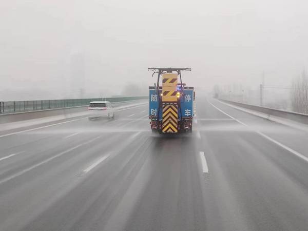 此次降雪環(huán)境溫度較高,除雪保暢重點(diǎn)由化雪變?yōu)榉乐怪攸c(diǎn)路段路面結(jié)冰。針對(duì)橋梁、大長(zhǎng)縱坡等重點(diǎn)路段,各工區(qū)根據(jù)建立的臺(tái)賬,突出重點(diǎn),精準(zhǔn)施策,采用融雪劑和融雪液相結(jié)合的方式進(jìn)行撒布,防止路面結(jié)冰。