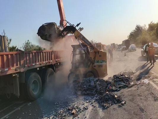 聞令而動(dòng),應(yīng)急響應(yīng)“快準(zhǔn)狠”。險(xiǎn)情即命令!工區(qū)立即啟動(dòng)應(yīng)急預(yù)案,養(yǎng)護(hù)人員快速集合,攜帶清障設(shè)備火速趕赴現(xiàn)場。抵達(dá)后發(fā)現(xiàn),路面堆滿水泥板碎塊,占據(jù)行車道,人工清理效率受限。工區(qū)當(dāng)即調(diào)整方案,增派鏟車、吊車等大型機(jī)械入場作業(yè),同時(shí)調(diào)配10名工作人員協(xié)同清理,同步安排專人在現(xiàn)場指揮交通,引導(dǎo)車輛有序通行,緩解擁堵。