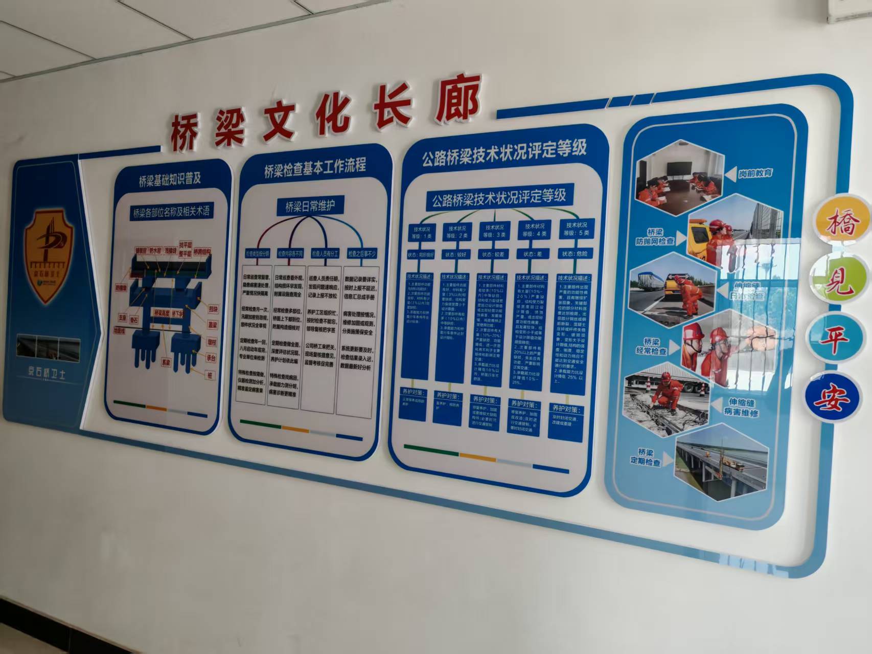 在經(jīng)歷前期室內(nèi)知識(shí)科普、橋梁現(xiàn)場實(shí)際教學(xué)后,為進(jìn)一步鞏固橋梁知識(shí)科普成果,橋梁科通過將橋梁各部位名稱及相關(guān)術(shù)語、橋梁檢查基本工作流程以及橋梁技術(shù)狀況評(píng)定等級(jí)等內(nèi)容結(jié)合橋梁示意圖在工區(qū)辦公樓一樓走廊內(nèi)進(jìn)行上墻展示。