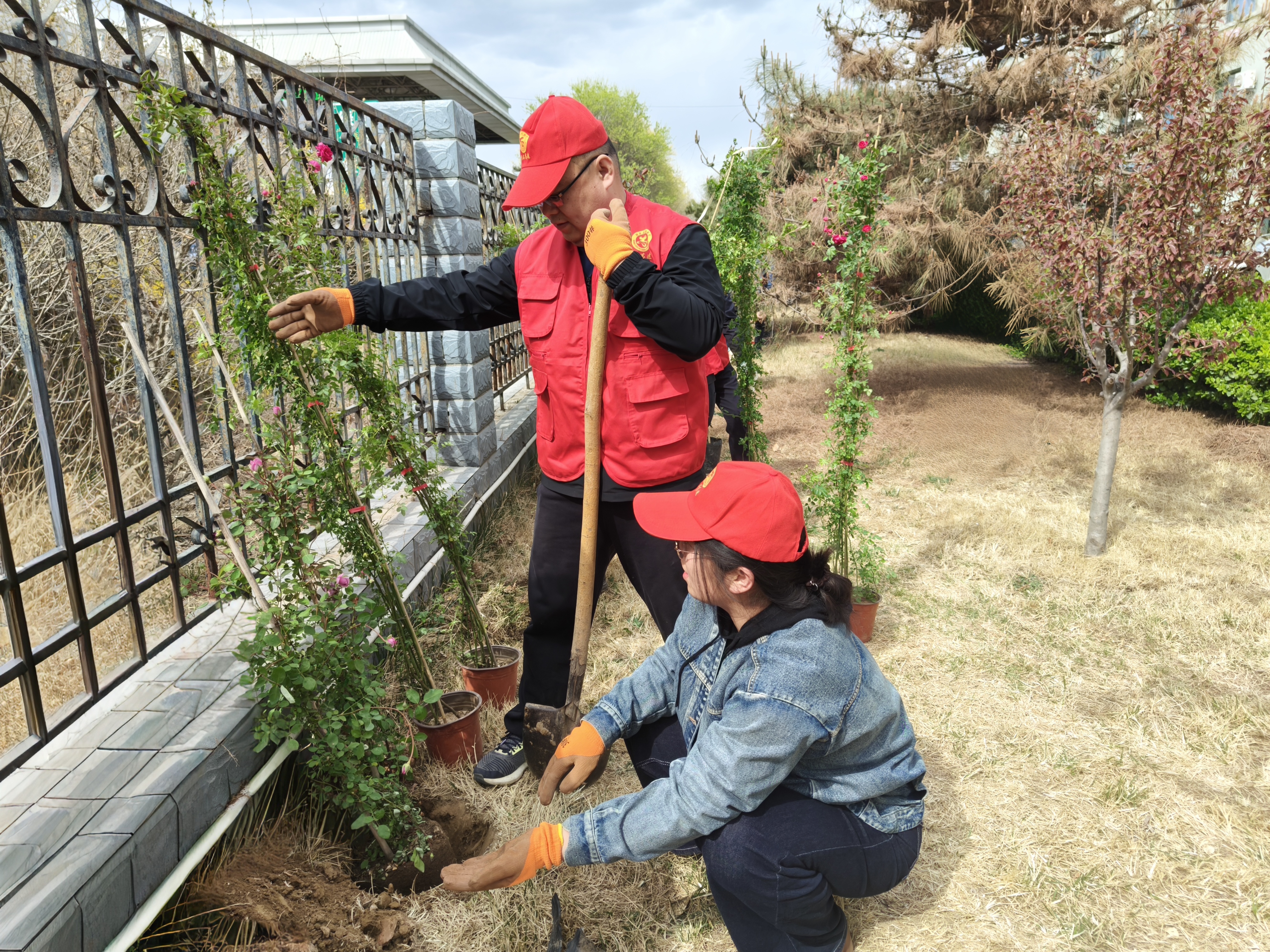 說干就干,經(jīng)過分工部署,同事們化身“園林工匠”,有的拿鐵鍬挖坑填土,有的拿剪刀修剪花枝,經(jīng)過兩個(gè)小時(shí)的團(tuán)結(jié)奮戰(zhàn),一棵棵花木沿著柵欄圍墻整齊地栽種成一排,隨著一股清冽的水流緩緩流淌而來,滲入每一寸土壤,每一棵花木都煥發(fā)出勃勃生機(jī)。原本單調(diào)的鐵藝圍欄上,薔薇與月季編織成延綿的花帶,粉紅、明黃、雪白的花朵在風(fēng)中搖曳,像一串跳動(dòng)的音符,為春日增添了些許詩(shī)意與溫情。