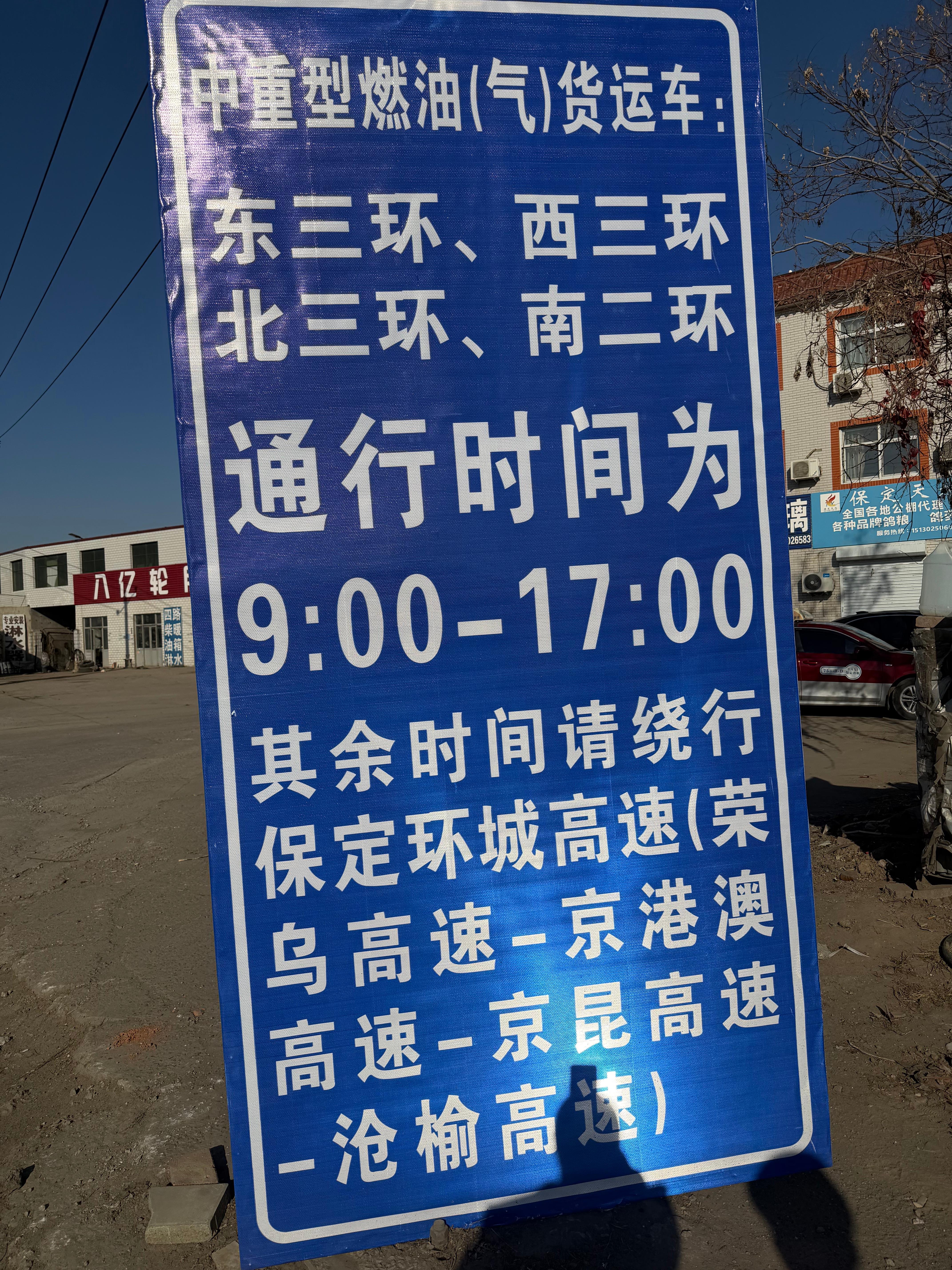根據(jù)保定市下發(fā)的《保定市生態(tài)環(huán)境保護(hù)委員會辦公室關(guān)于啟動重污染天氣Ⅱ級應(yīng)急響應(yīng)措施的通知》,自2025年11月3日18:00時保定市交警支隊一大隊民警在南二環(huán)與東三環(huán)交叉口東北方向設(shè)置警示牌并對部分貨車進(jìn)行管控。有通行證的中重型燃油(氣)貨運車通行三環(huán)時間為9:00-17:00,無通行證的此時間段須繞行高速。