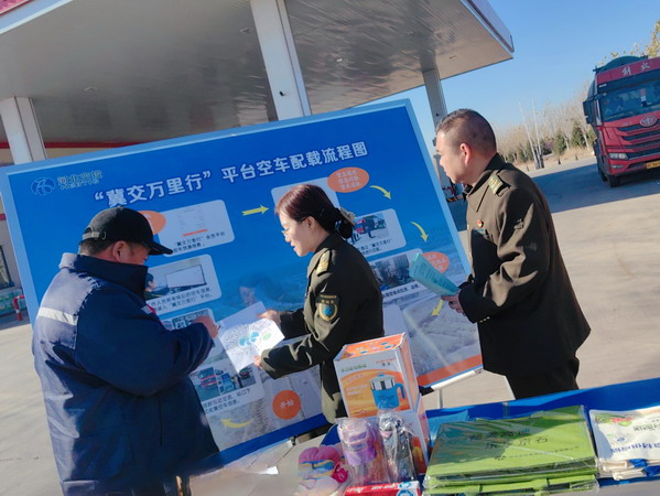 為確保推廣實(shí)效,望都站采用“固定宣傳 + 地推服務(wù)”模式。在鴻天加油站,固定宣傳點(diǎn)設(shè)立了服務(wù)窗口,工作人員以專業(yè)知識(shí)詳解“冀交萬(wàn)里行”“京石易行”的注冊(cè)流程、通行優(yōu)惠、空車(chē)配載功能及積分兌換規(guī)則,讓司乘“一站知全貌”,輕松了解平臺(tái)優(yōu)勢(shì)。