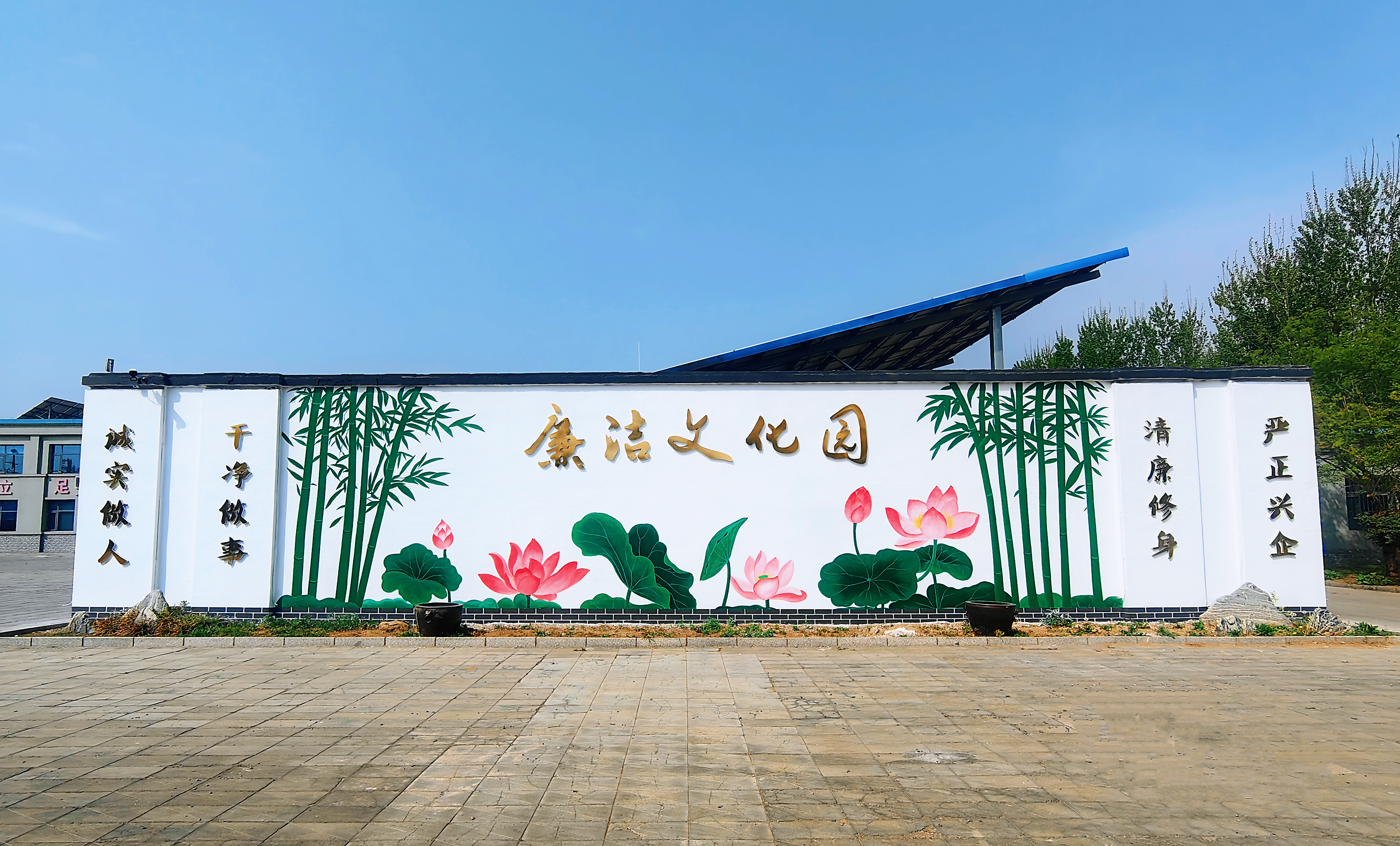 影壁墻以“崇廉尚潔 清風(fēng)護航”為主題,采用傳統(tǒng)水墨丹青技法,巧妙融入荷花、蓮葉、翠竹等廉潔元素,高潔的荷花與挺拔的翠竹交織成景,勾勒出“一塵不染香如故”的清廉本色和“未出土?xí)r先有節(jié)”的剛正品格,也深刻詮釋出“廉者自清”的精神內(nèi)涵。左右兩側(cè)“清廉修身、嚴(yán)正興企”“干凈做事、誠實做人”的燙金標(biāo)語,與廉潔從業(yè)要求相呼應(yīng),形成“倡廉于形、思廉于心、踐廉于行”的濃厚氛圍。