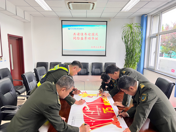 閱讀結束后,工會主席郝國恩帶領職工們投入到“同繪盛景頌華誕”活動,大家以畫筆為工具,以對黨的熱愛為靈感,共同繪制出一幅壯麗的畫卷。畫卷中,鮮艷的五星紅旗迎風飄揚,氣勢磅礴的華表屹立在天安門前,象征著在中國共產(chǎn)黨的領導下,國家的繁榮昌盛和人民的幸福生活。
